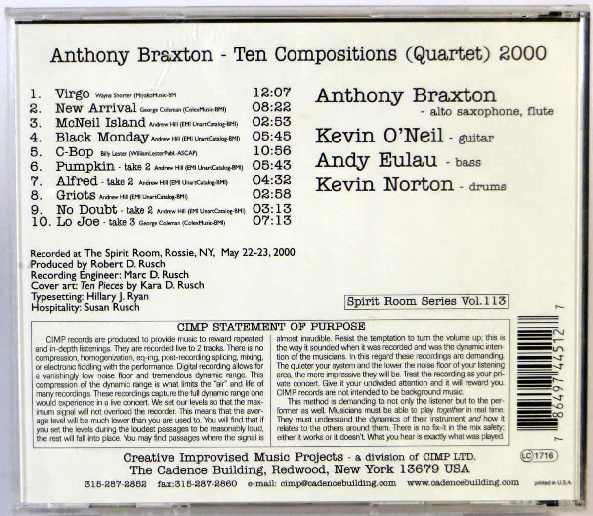 ANTHONY BRAXTON – Ten Compositions (Quartet) 2000 – CD